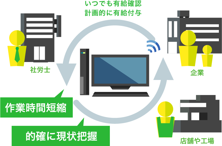 パソコン、スマホから有給休暇、代休、振休等、様々な休暇が管理ができます。