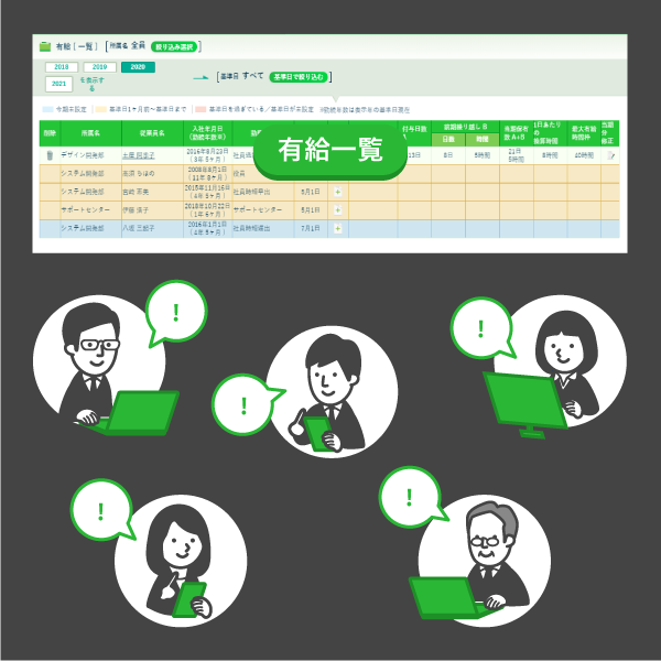 パソコン、スマホから簡単にリアルタイムで有給使用状況を確認することができるため、残日数や、義務付けられた使用日数を取得しているかの確認ができます。
